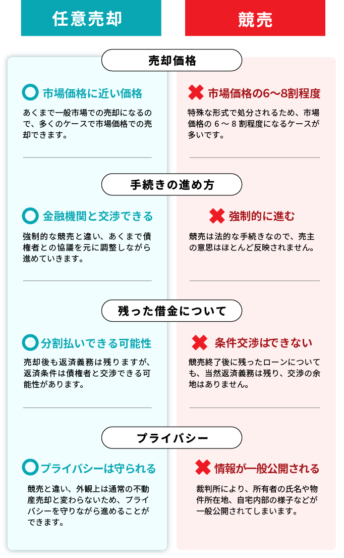 お早めに相談いただければ、返済スケジュールの変更(リスケ)などもご提案できる場合もあります。任意売却という選択をした際も、競売と比べて信用情報への悪影響を軽減できます。